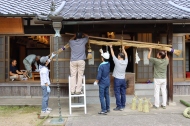 | 平成19年の井原町秋祭りは10月28日。一週間前の10月20〜21日には、足次山神社の区当番や新講当番の人達がそれぞれの役割に追われました。 新講中組(四番組)の関係者8人は、20日午後1時30分から大当番の倉掛5−1組佐藤勲さん宅に集まり、大しめ縄作りを行いました。約3時間半で長さ約4mの立派な大しめ縄が出来上がり早速、拝殿に奉納され、前年の大しめ縄は拝殿前の鳥居へ付け替えられました。 |