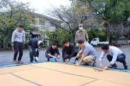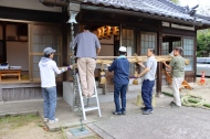 | 22年度の秋季大祭は午後から雨。神楽が急きょ拝殿で行われることになったため、区当番の人たちは神殿(舞台)設営に追われました。 |