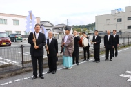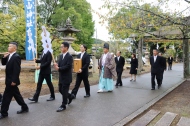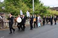 | 足次山神社新講当番西組が平成22年10月16日(土)、午後3時から足次山神社へ宮上がりを行いました。 岡本昇さんを先頭に大山宮司ら10人の一行は、太鼓を打ち鳴らしながら神社へ到着しました。 |