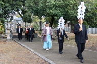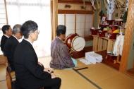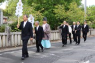 | 区当番を務める倉掛1組と2組の住民らが平成21年10月17日、午後2時30分から足次山神社へ宮上がりを行いました。 一行は川相肇総代長を先頭に大山宮司、1組自治会長の仁城さん、2組自治会長の若林さんが続き、太鼓を打ち鳴らしながら神社へ到着。さっそく神事が執り行われました。 |