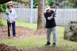 森典子会長の開会挨拶に続いて午前9時30分、メンバーは4組に分かれて同時スタート。障害物の多い境内特有の難しいコースながら、ホールインワンを記録するなど、曇り空の下で熱戦を繰り広げました。