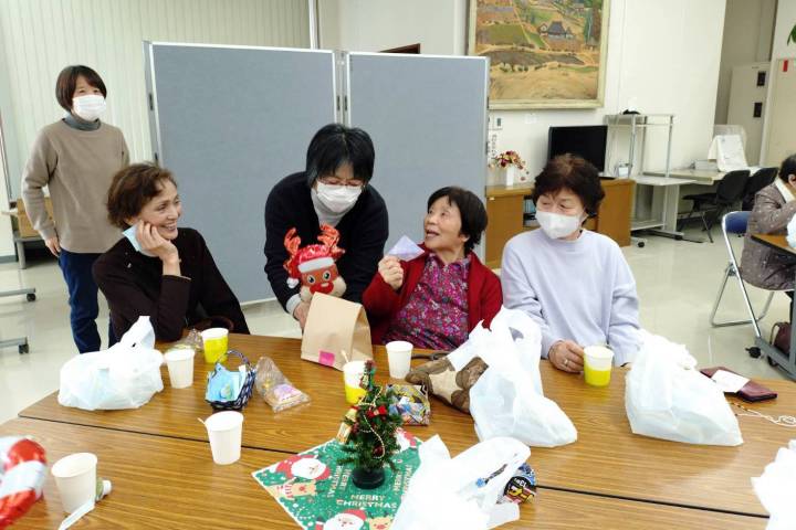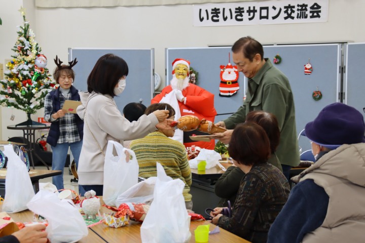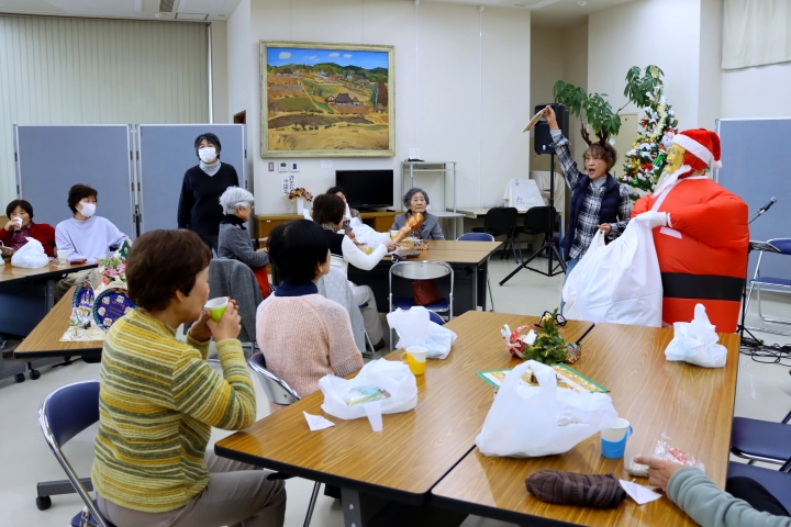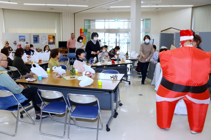 2部では、サンタクロースに扮した片岡宏文民生児童委員から参加者全員にクリスマスプレゼントが配られ、ケーキなどを食べながら楽しいひと時を過ごしました。